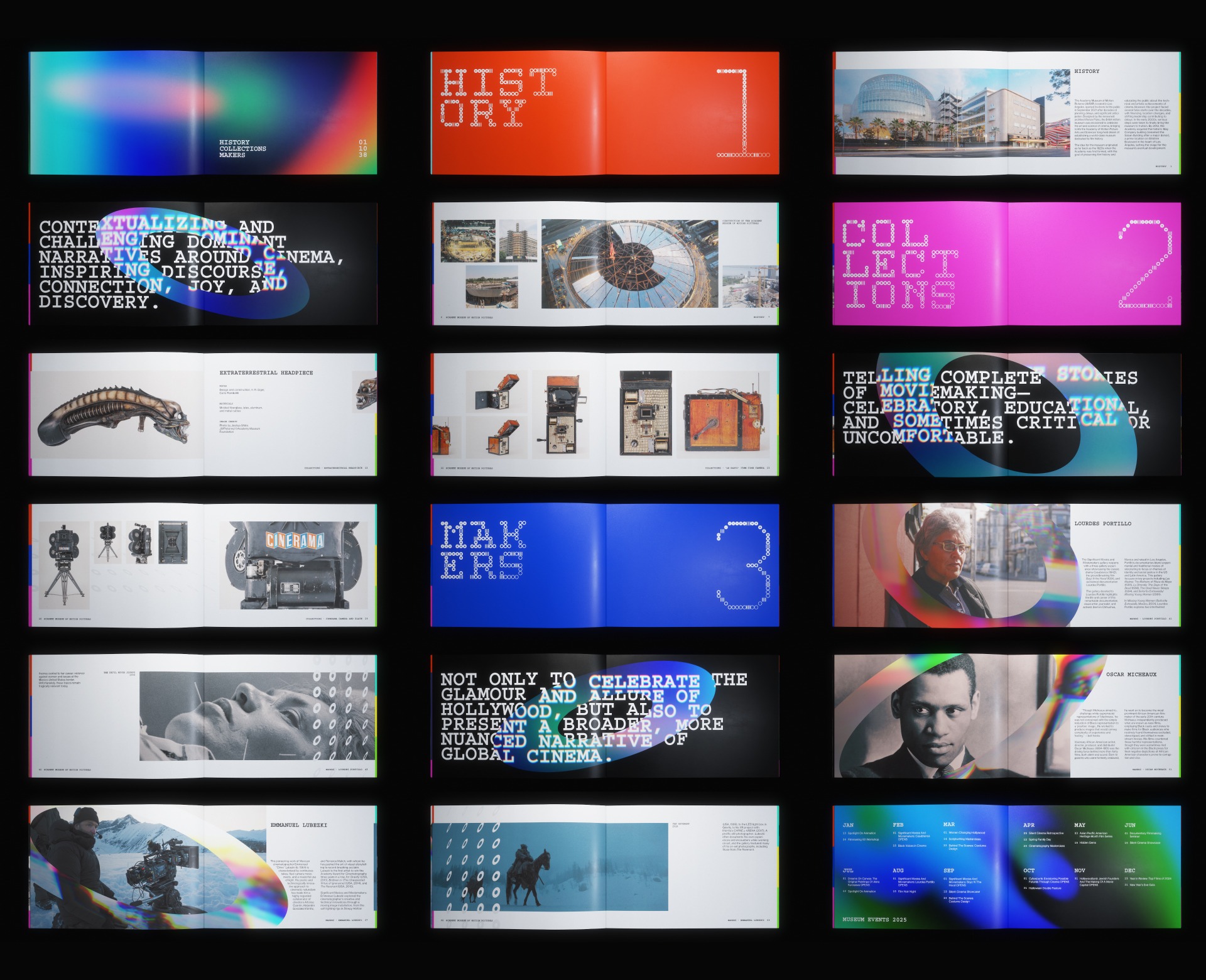The catalog extends the Academy Museum’s identity into print, using circular forms, distortions, and gradients to reflect the language of filmmaking. The catalog includes a history of the museum, permanent collections, and highlighted creators.